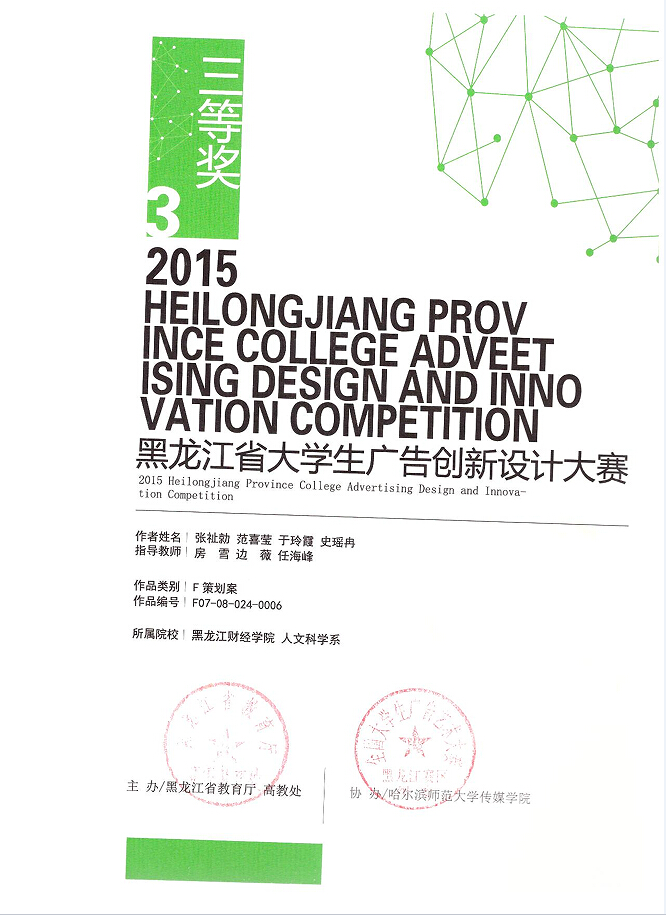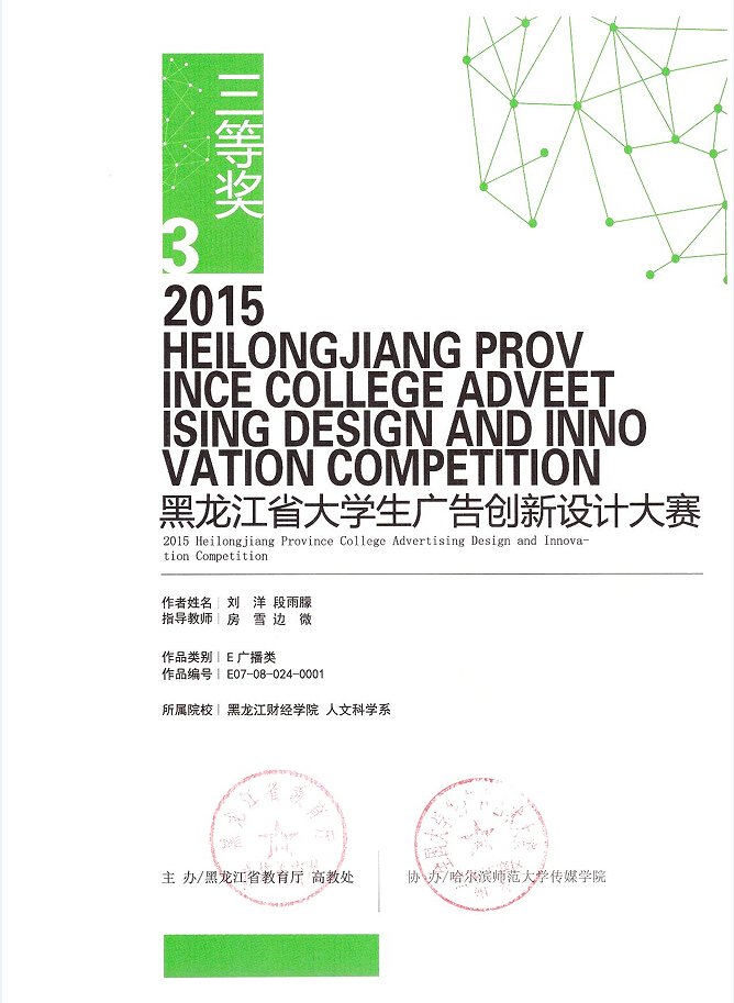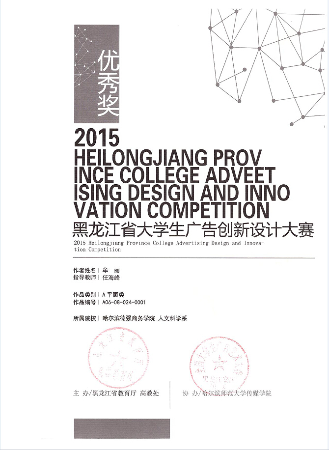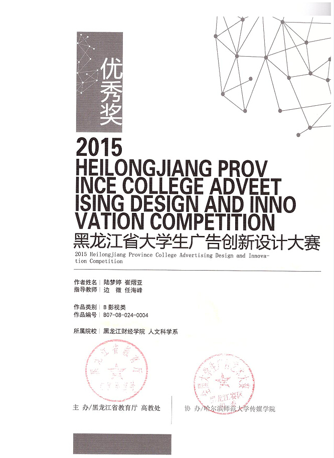 本届“大广赛”的竞赛口号是“创意我追梦”,共有2304所参赛学校组织学生积极投入到赛事创作中,作品总数高达149103组,近23万余件。经过选拔,我院人文科学系广告学专业教学团队指导推送的作品获得国家级优秀奖1件、黑龙江省赛区二等奖1件、三等奖3件、优秀奖6件。(获奖名单及证书附后)