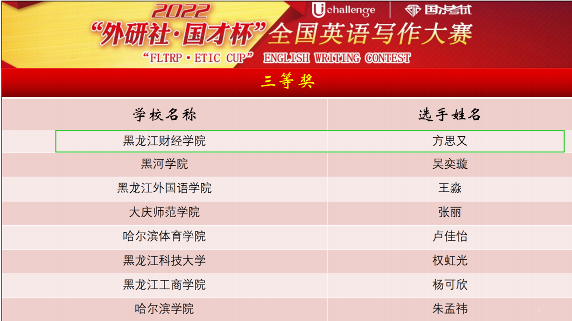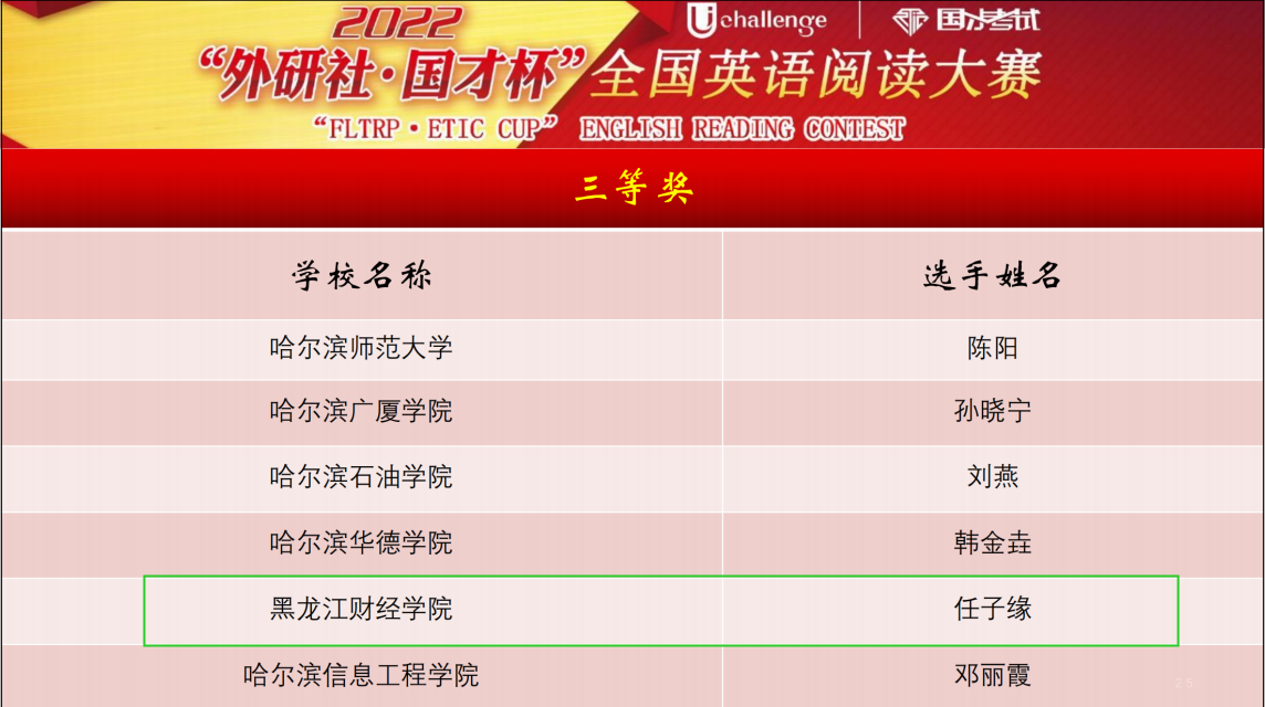 2022年10月29日由黑龙江省教育厅主办,黑龙江大学和哈尔滨理工大学共同承办的“2022外研社·国才杯”全国英语演讲 写作 阅读大赛“黑龙江省赛区决赛圆满落下帷幕,本次大赛由外语教学与研究出版社和黑龙江省大学外语教学专业委员会协办。受疫情影响,今年的大赛采取“线上参赛”和“线下评审”的模式,参赛选手在“云端”竞技,评委在承办单位线下评审。包括哈尔滨工业大学、哈尔滨工程大学、东北林业大学、东北农业大学等省内40余所高校具有不同专业背景的200余名选手进入本次决赛。我校选手分别获得了此项赛事的演讲比赛三等奖一项,写作比赛三等奖两项,阅读比赛三等奖两项的优异成绩。